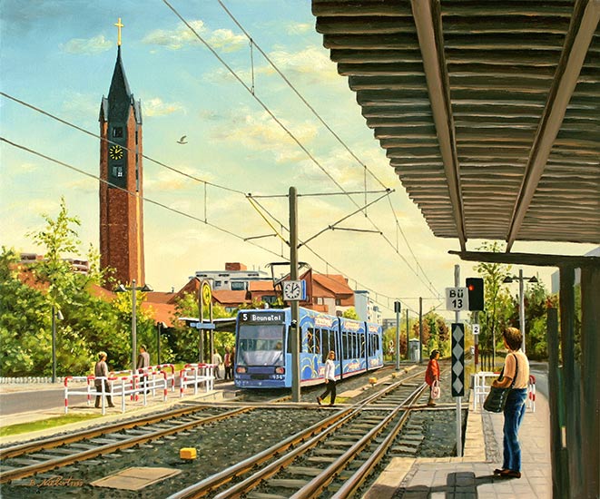 Gemalte Bilder von Baunatal, Suchbegriffe zum Baunataler Gemälde: gemaltes Baunatal, Altenbauna, Straßenbahn, Strassenbahn, Haltestelle, Straßenbahnhaltestelle, Strassenbahnhaltestelle, Hessen, Nordhessen, Baunataler Gemälde, Ölgemälde, Ölbilder, Ansicht, Ansichten, Alte, gemalte Bilder von Baunatal, Bild, Baunataler Kirche