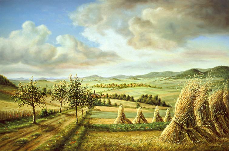 Relevante Suchbegriffe der Gemäldeausstellung Baunatal: Landleben, Feldarbeit, Landarbeit, Bauerntum, Ernte, Erntezeit, Erntebild, Erntegemälde, Getreideernte, Getreidehocken, Hocken Garben, Felde, Feld, Baunatal, Altenritte, Großenritte, Besse, Trift, Bild, Bilder, Ölbild, Ölbilder, Ölgemälde, Gemälde