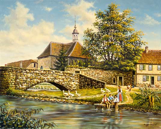 Gemälde zu den Themen: Fritzlar, Ansicht, Ansichten, Alte, Alte Ansichten, Heilig-Geist-Kapelle, Heilig, Geist, Kapelle, Spitalsbrücke, Spitalbrücke, Brücke, Malerwinkel, Ansichten, Bild, Bilder, Ölbild, Ölbilder, Gemälde, Mühlgraben, Mühlengraben, Hessen, Nordhessen, Gemälde